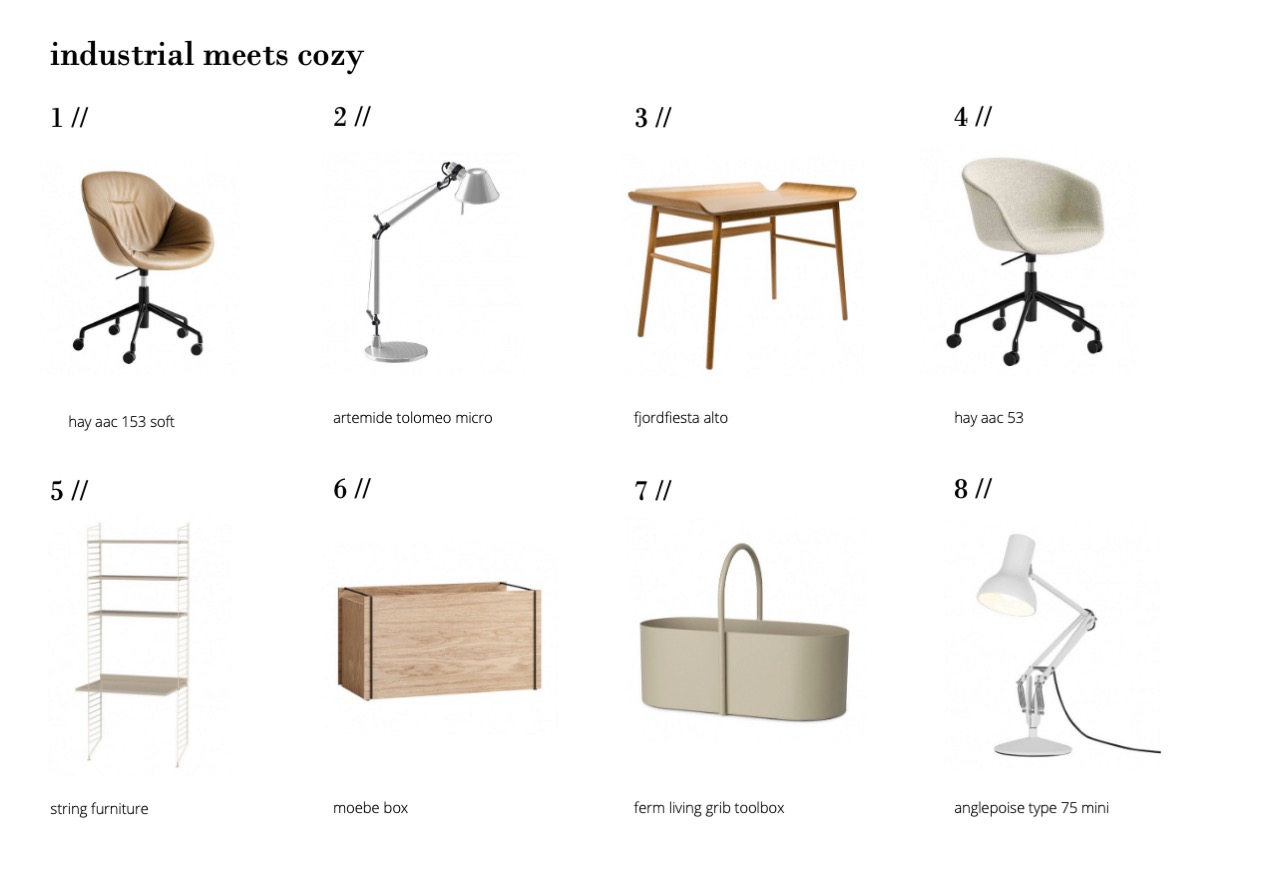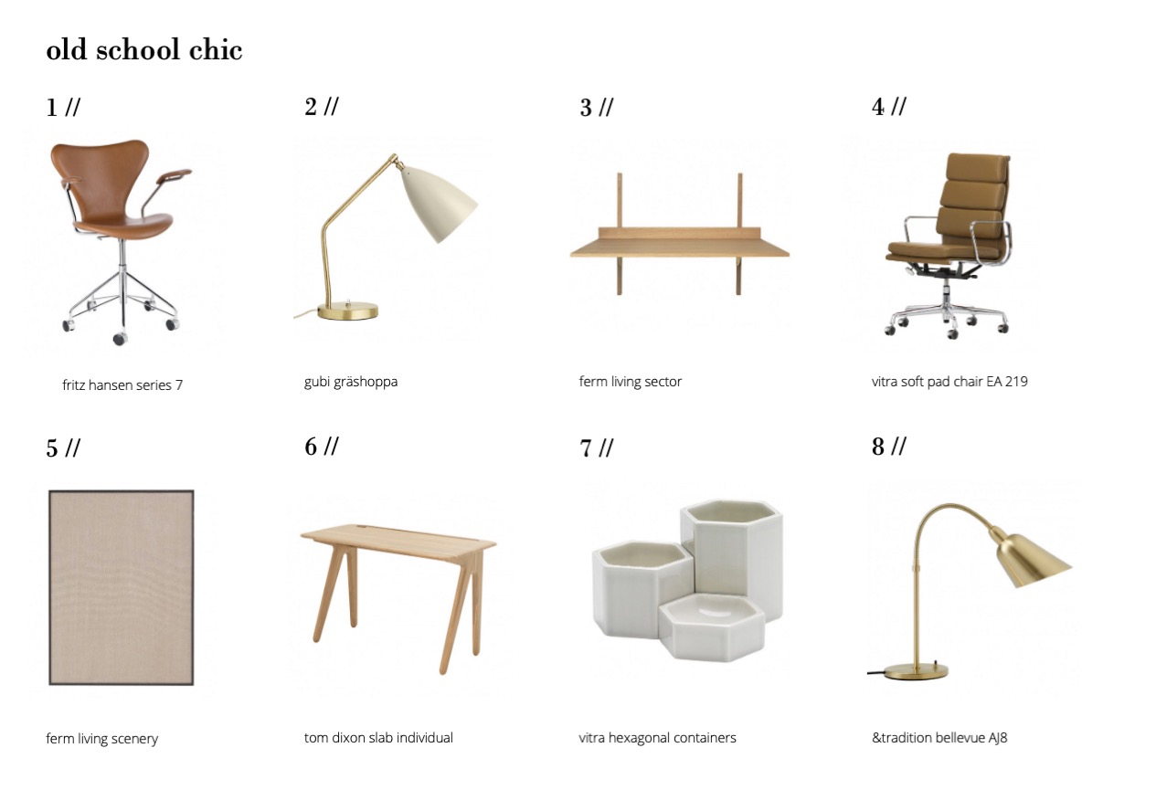 the first is old school chic – focusing on classic or almost vintage-looking designs that still look modern rather than retro. the second collection gives a cozy twist to thepopular industrial look. i opted for neutral colors and materials in both, because that’s what i would love for my interior, but such a subtle color palette can also make a work space feel a lot less intrusive. especially if you don’t succeed in keeping it tidy 100% of the time (who does??), then it’s nice to not have too many color contrasts also vying for your attention. after all, at the end of the day, you can’t get into your car and drive away from your work place – so it’s important that it’s not a constant source of agitation or stress.