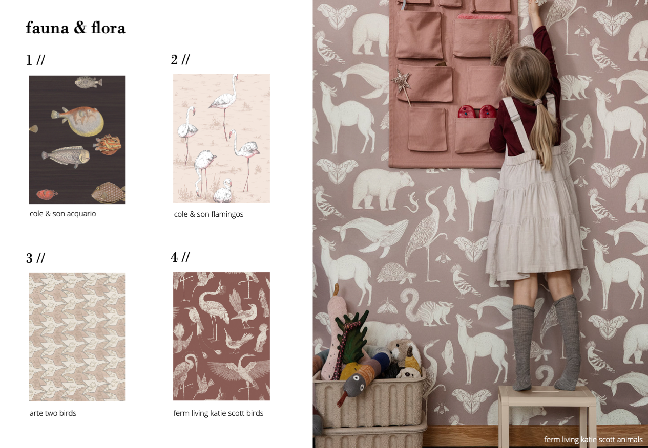 the first is fauna & flora – a childhood favorite, but make it stylish. i’d say ‘no thanks’ to papering brightly colored animal prints all over the walls, but the selection of ANIMAL WALLPAPERS out there right now is simply beautiful. the perfect balance between the parents’ wish to create a classy home, and the kids’ need for something to tickle their imagination.
