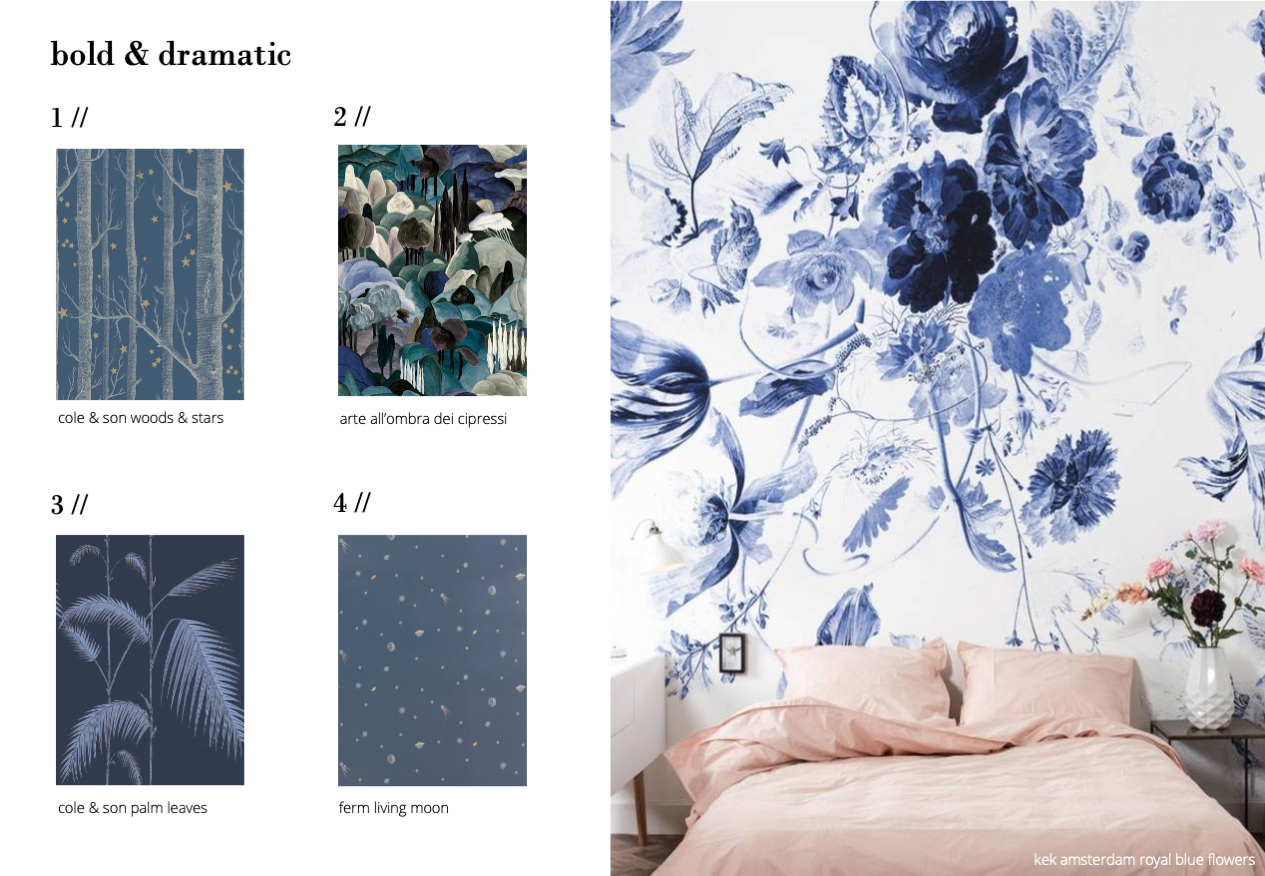 while the first moodboard is soft and delicate, i also love wallpaper for its ability to add a huge dose of drama to a room. if your vibe is more moody than sweet, make sure to browse wallpapers by color. over at COLOREDWALLS i looked through all the BLUE COLORED WALLPAPER to find the most moody and bold designs, for example.