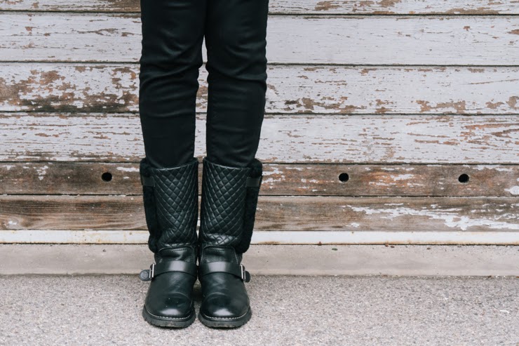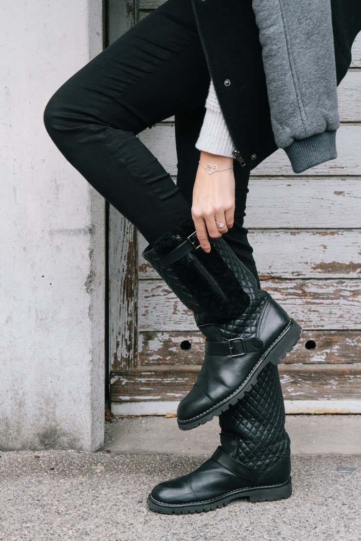 also wearing a theory sweater // these incredibly soft and comfortable luxe sateen super skinny jeans kindly gifted to me by j.brand // this madewell tee (you can barely see) // chanel boots // and the geometrics bracelet i designed for diamanti per tutti