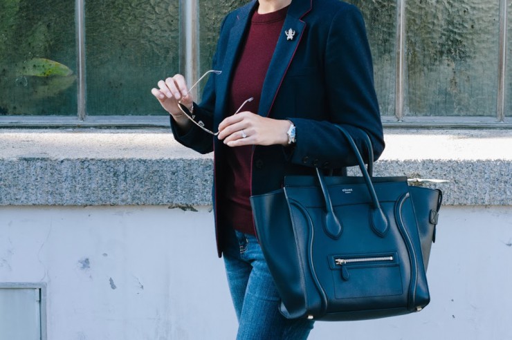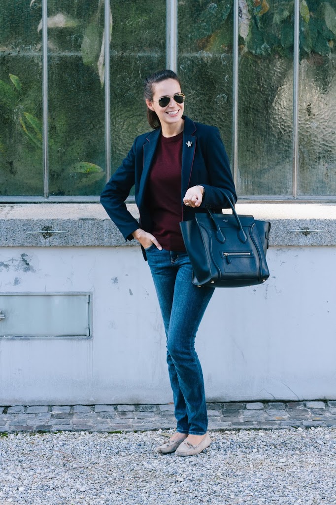 wearing a soeur blazer // macon et lesquoy robot badge // current/elliott jeans // j.crew sweater // tod’s loafers // céline bag // ray-ban sunglasses // omega watch